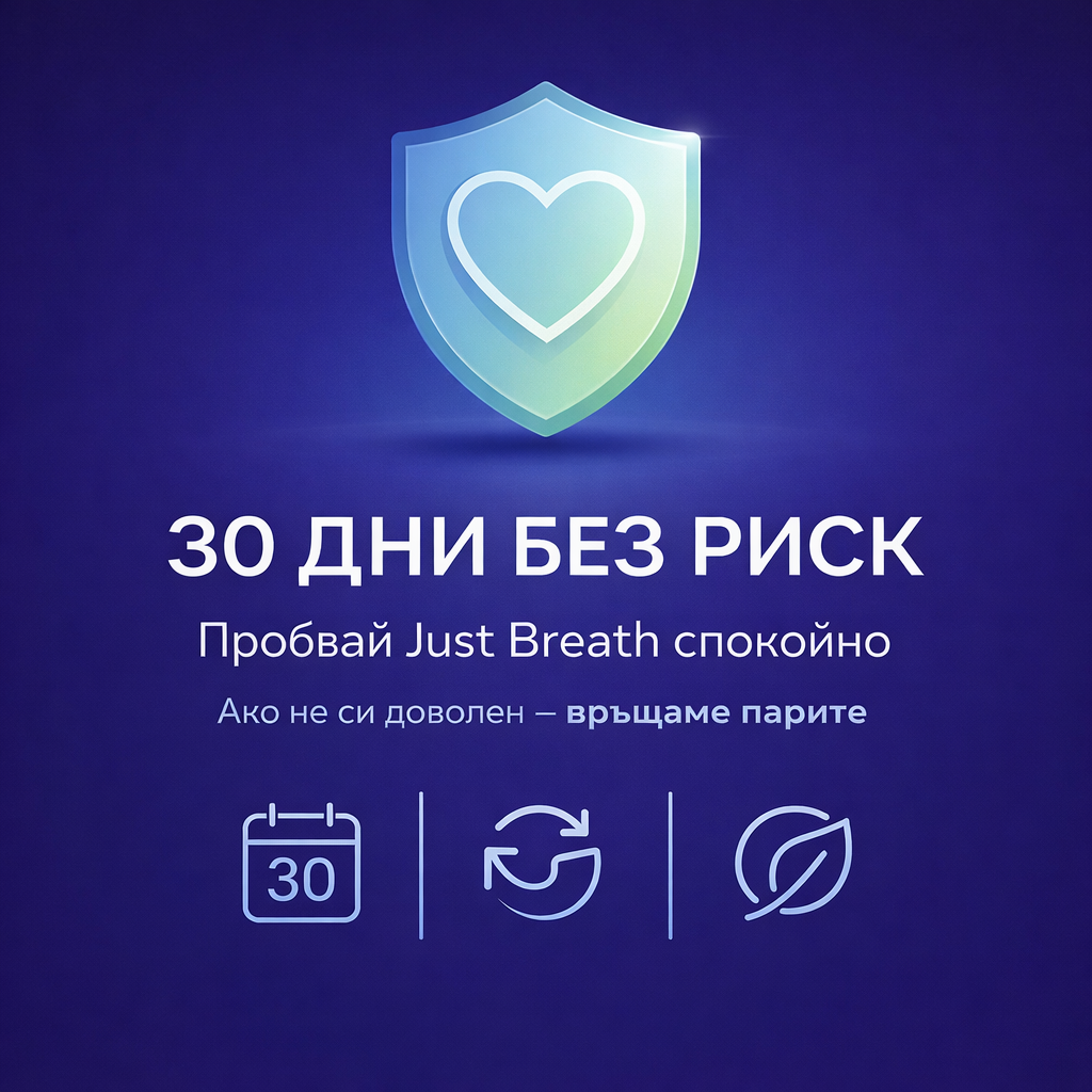 shield_with_heart Пробвай JustBreath в продължение на 30 дни. Ако в този период не усетиш реална разлика в дишането или качеството на съня, ще ти върнем 100% от сумата.